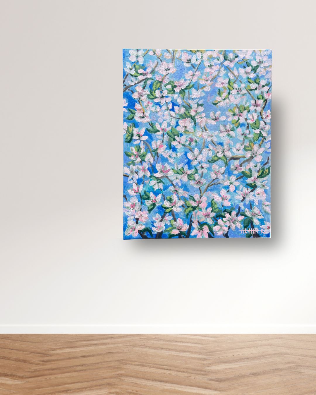 Painted in luminous acrylic on a stretched, professional-grade canvas, this piece has visible brushstrokes and layered detail that give the blossoms motion and life. The background is a hand-mixed blue that shifts with the light, anchoring the soft pinks and creamy whites of the flowers. The edges are fully painted for a clean, contemporary finish—no framing required (though a float frame would elevate the look beautifully if desired).