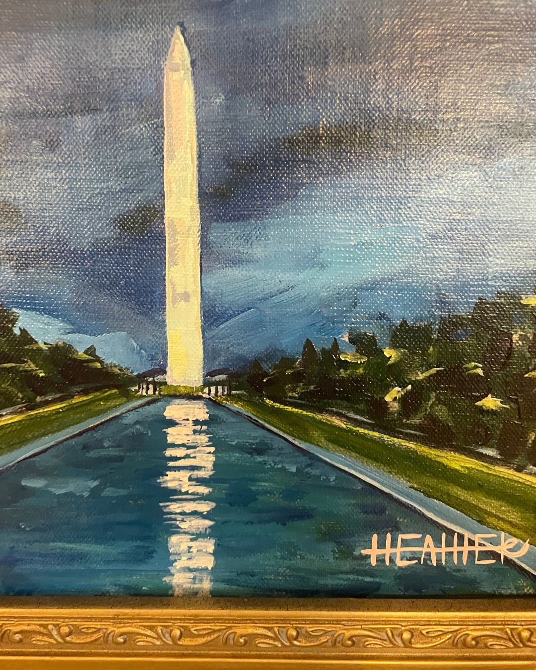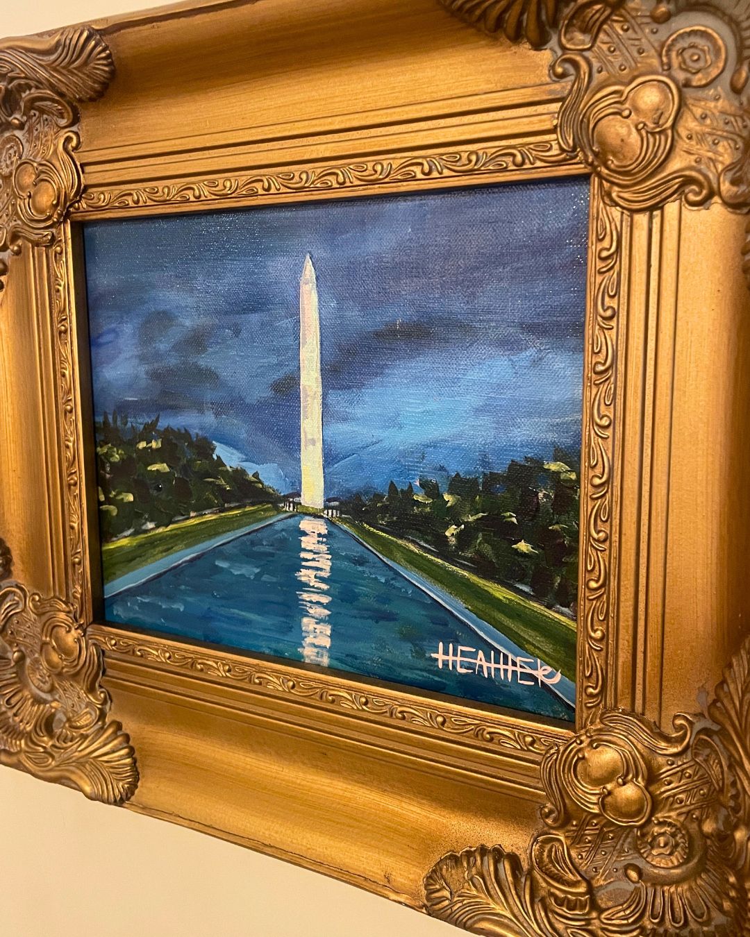 This original work is painted in expressive acrylic on a textured 8" x 10" linen canvas board. The scene balances contrast and harmony, with the Monument standing tall amid a glowing sky and its reflection diffused gently across layered brushstrokes.