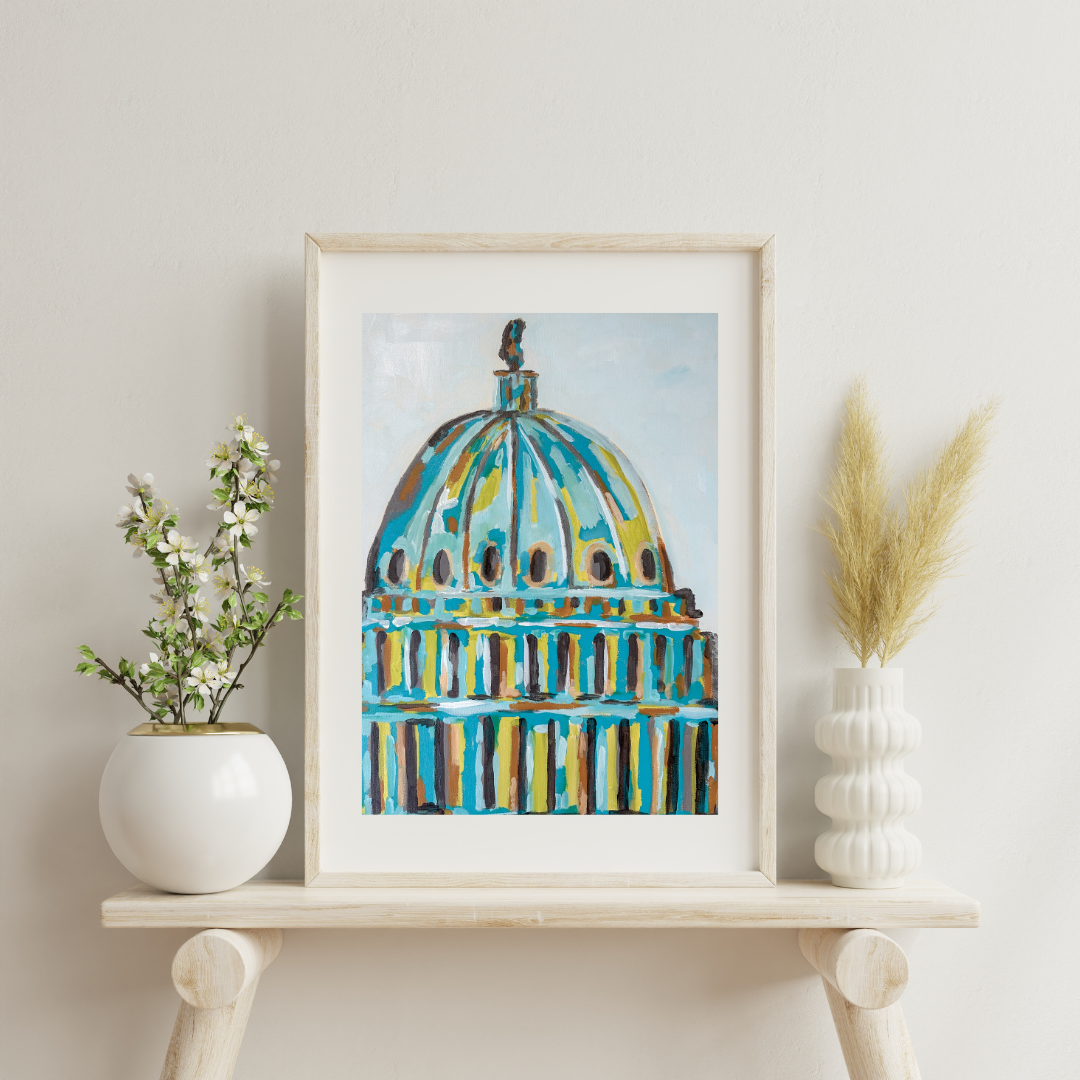 Rainy Days Dome showcases colors of green, turquoise and blue, mimicking the capitol dome against an rainy day sky. Gicleé print of Washington D.C.'s Capitol Dome on archival paper.
