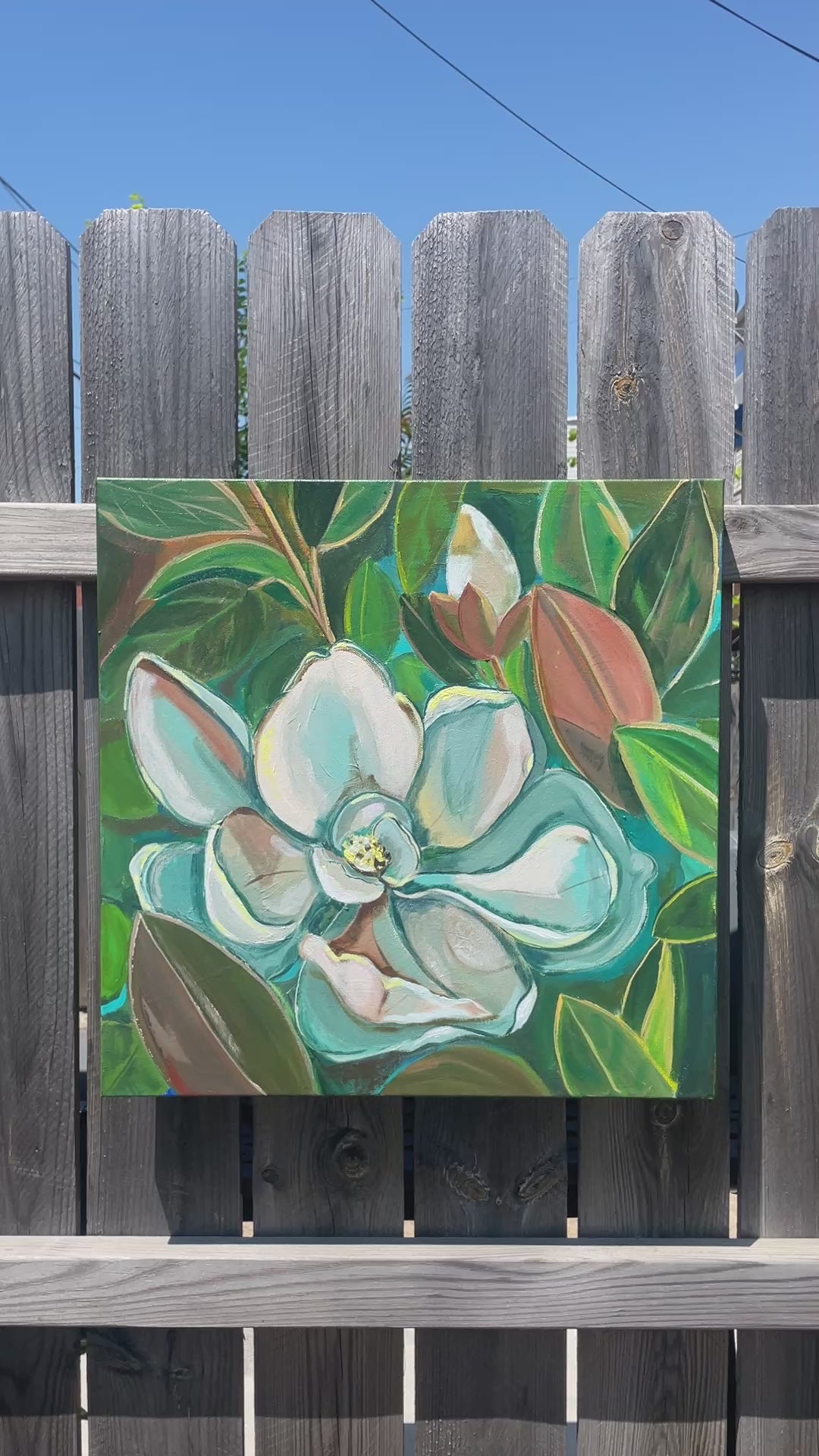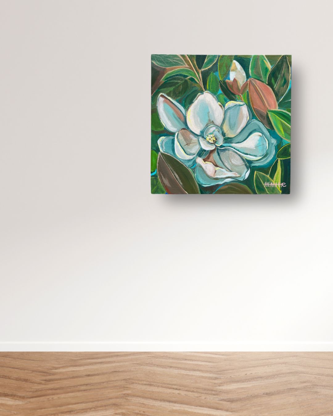 This original piece is painted with layered acrylics on a 1.5" deep gallery-wrapped canvas. Soft greens and muted blues provide a grounded, calming backdrop for the two magnolias—one emerging with grace, the other waiting in silence. Texture brings depth and movement to the surface, echoing the quiet momentum of change.