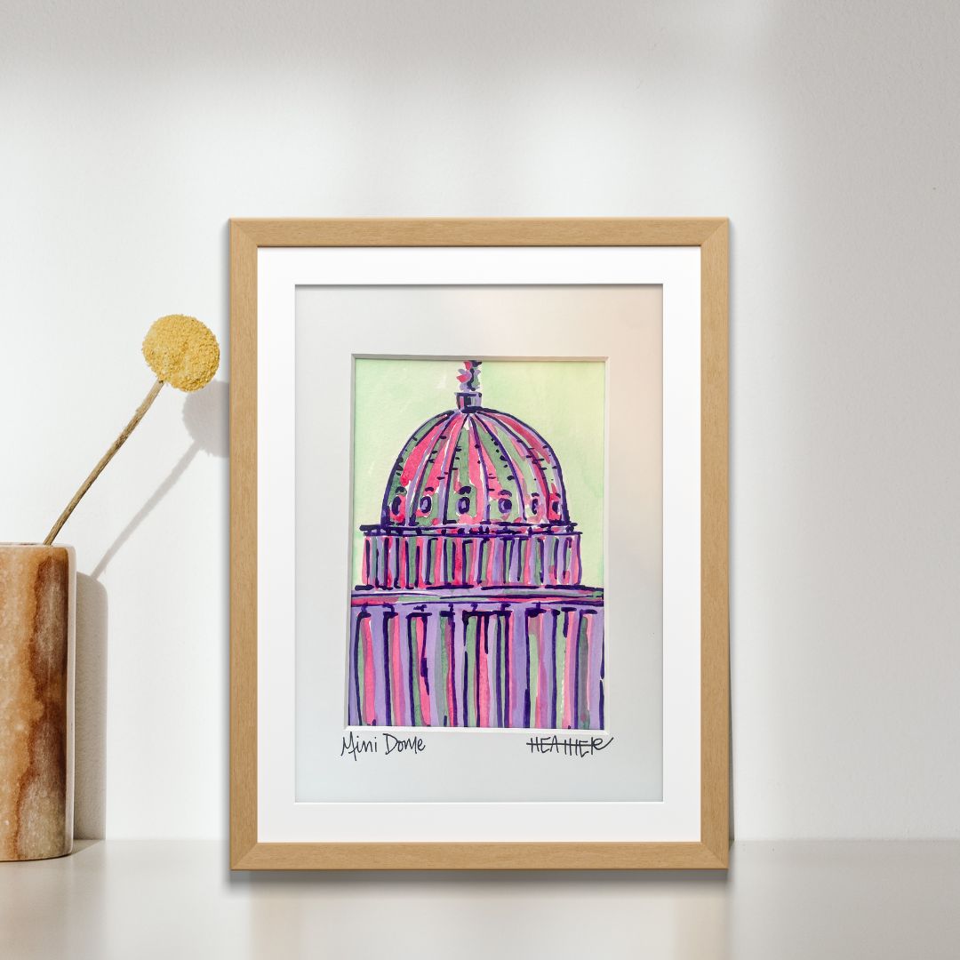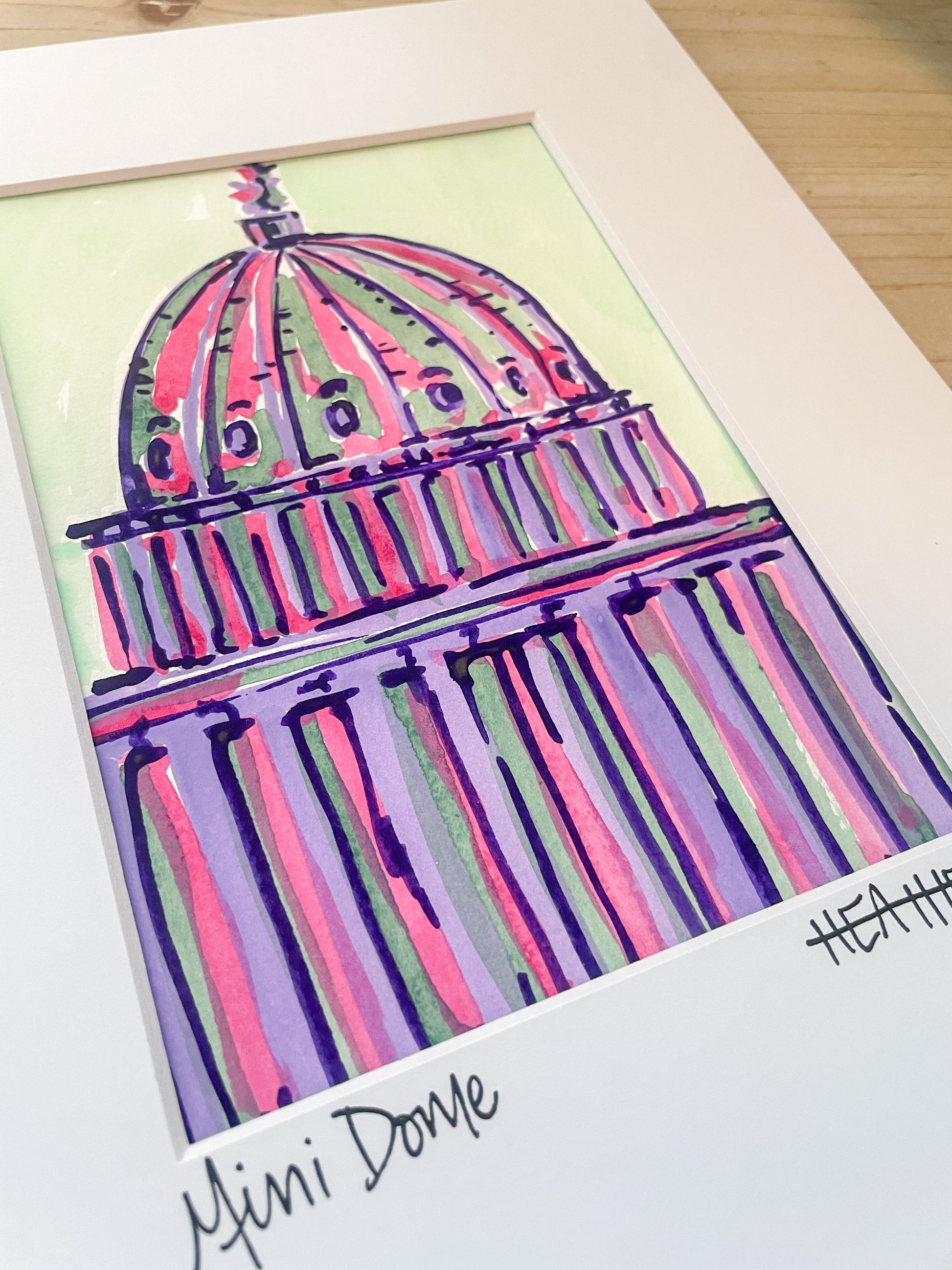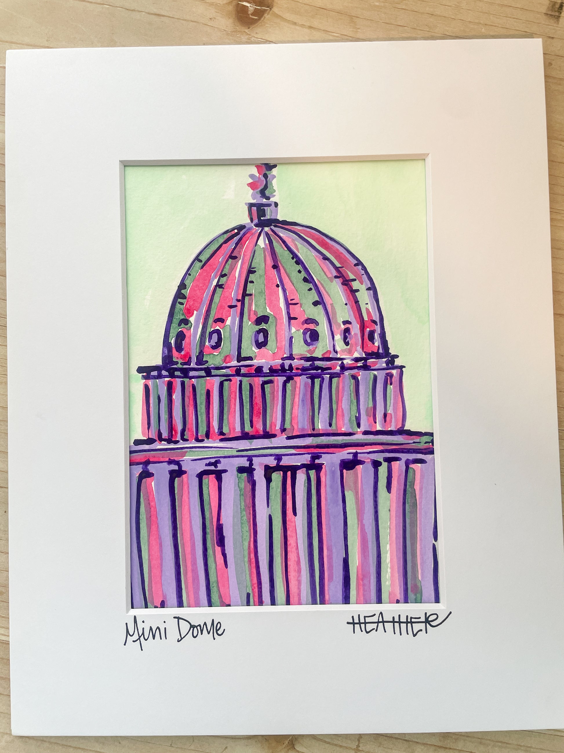 This original Mini Dome on paper is hand panted using Holbein Acrylagouache on heavy cold pressed watercolor paper. Designed and painted by Heather Duncan, this original piece boasts bright colors and whimsical capitol views.