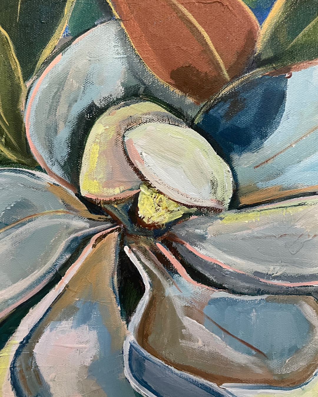 Painted with expressive acrylics on a 12" x 12" x 0.75" gallery-wrapped canvas, this magnolia remains partially closed, rich with tension and promise. Subtle textures and soft color layering in greens, pinks, and creamy neutrals give the piece emotional depth and a quiet sense of movement.