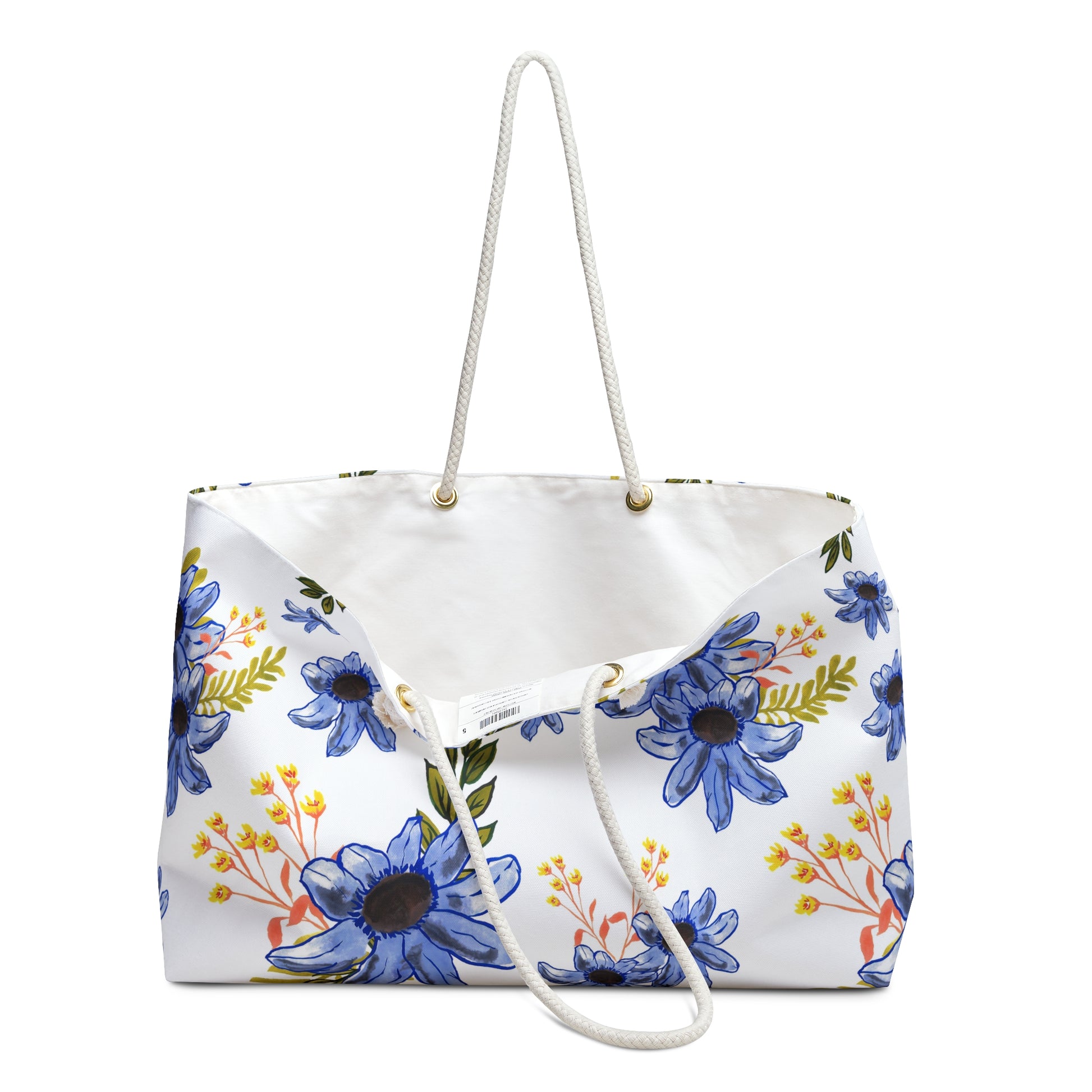 - Rope handles with cream-colored rope handles fed through gold color metal grommets