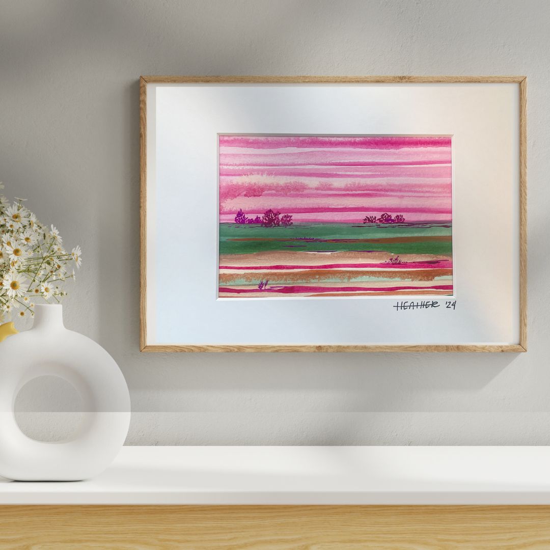 This original Open Skies landscape on paper is hand panted using Holbein Acrylagouache on heavy cold pressed watercolor paper. Designed and painted by Heather Duncan, this original piece boasts bright colors and whimsical plains views.