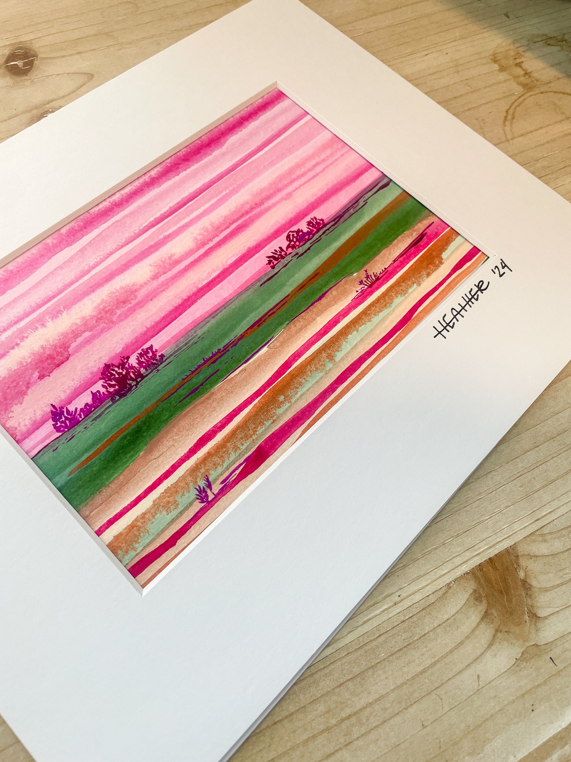 Mini originals make great gifts from friends, family or yourself. This is a 5x7 in painting in a mat that measures 8x10. Painting is hand labeled and signed. (wooden frame is not included- for staging purposes only)