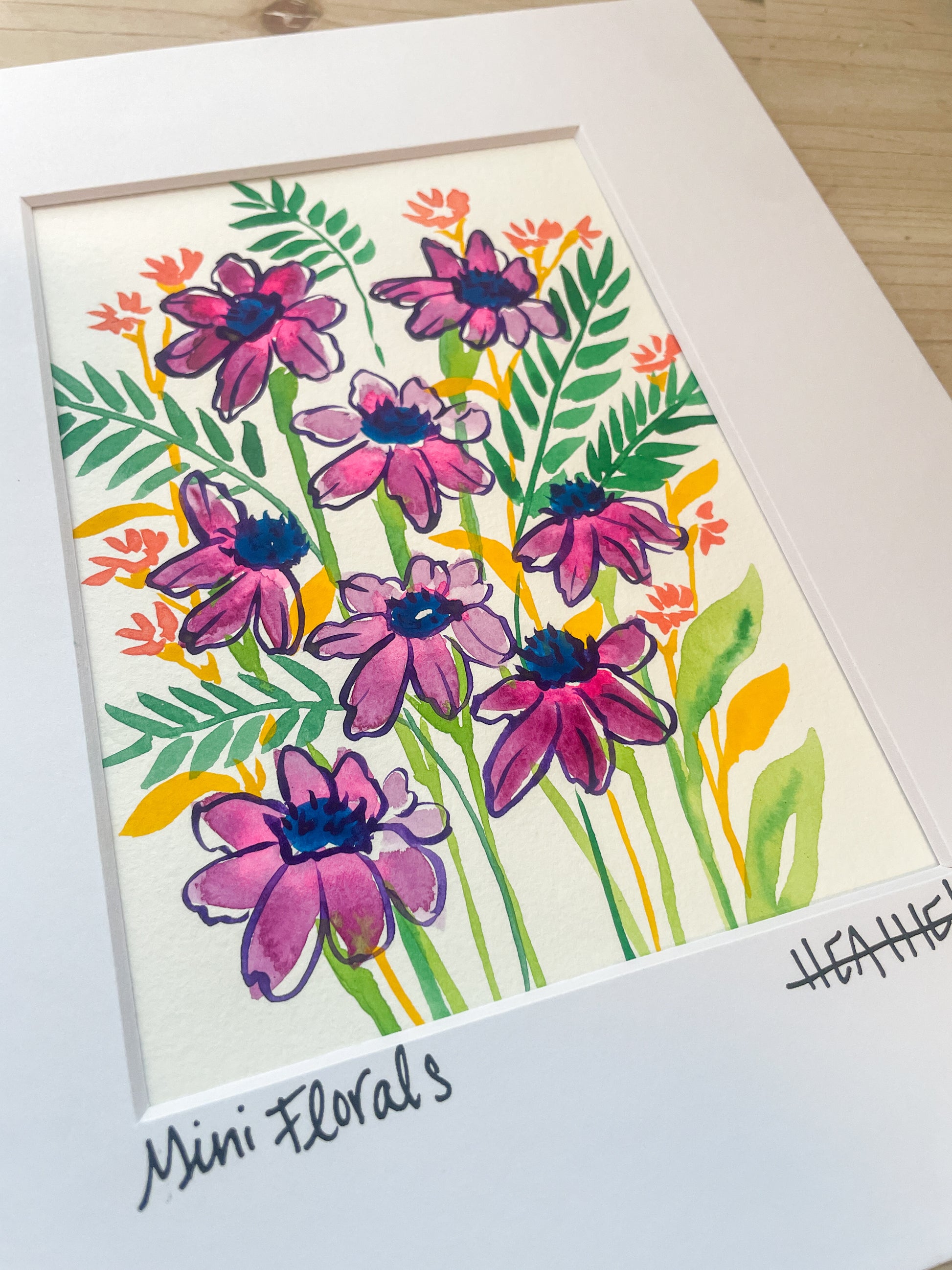 This original Mini Florals on paper is hand panted using Holbein Acrylagouache on heavy cold pressed watercolor paper. Designed and painted by Heather Duncan, this original piece boasts bright colors and whimsical florals.