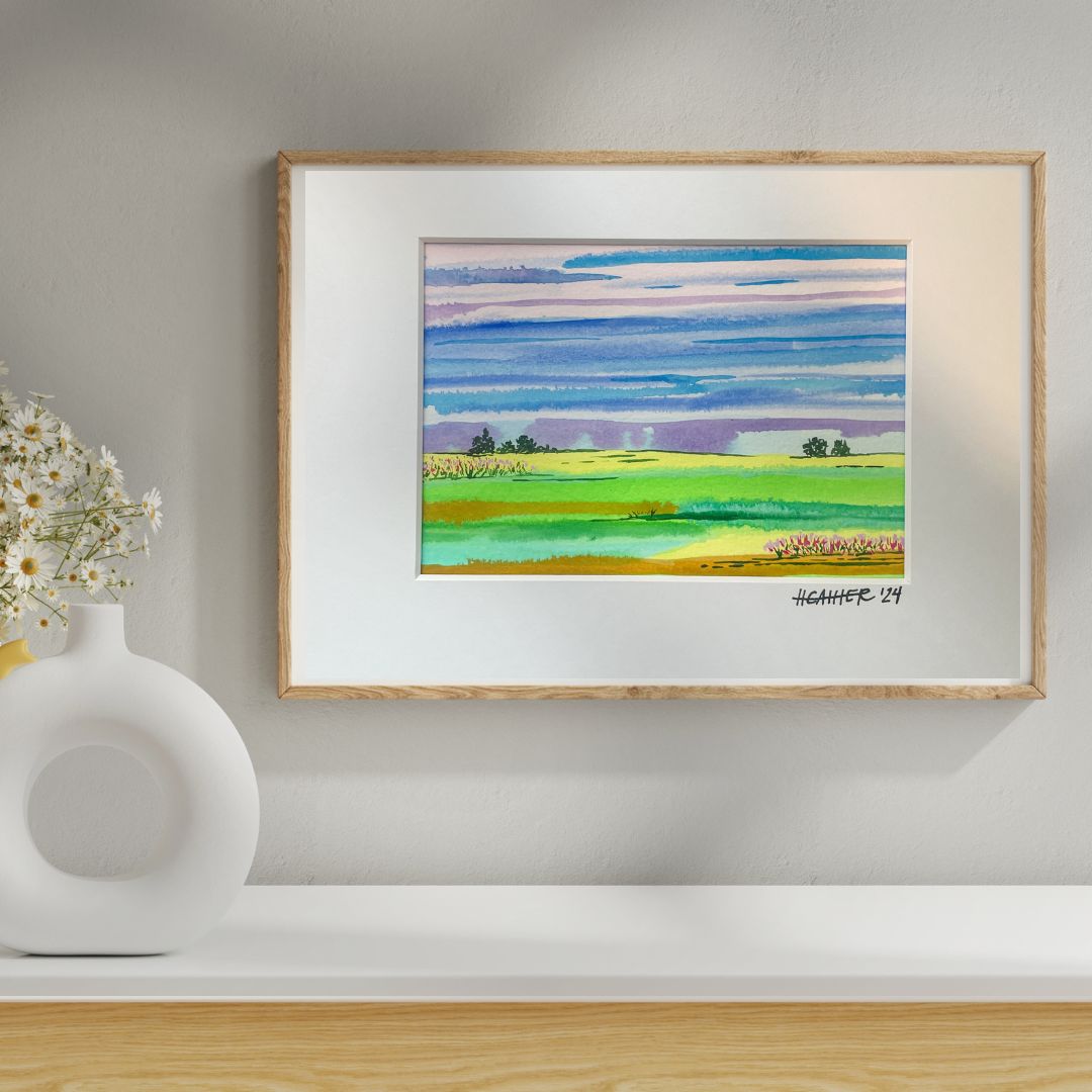 This original Open Skies landscape on paper is hand panted using Holbein Acrylagouache on heavy cold pressed watercolor paper. Designed and painted by Heather Duncan, this original piece boasts bright colors and whimsical plains views.